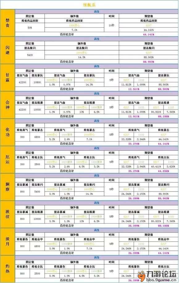 上面五张图,第一张是四系列技能检索表,后面四张是四个系列技能满级数据。值得注意的是,除了四个被动和三个贵重,其他技能都是有两种效果的,而第一种效果是受两系属性共同影响。比如锋利,提高攻击这个效果,是受斗志和忠心共同影响的,第二效果提高命中才只受斗志影响。