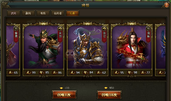 通过消耗免费的招将令(日常活动产出)或者少量的元宝,玩家就可以在酒馆招募到心仪的将领。招募采用随机的方式,各种强力武将等着你!啊