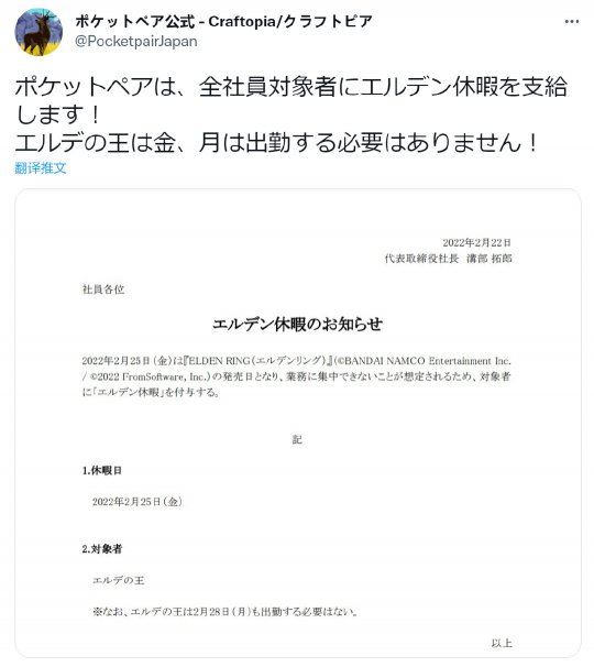 “2月25号是《艾尔登法环》的发售日,考虑到无法集中精力工作,给予“Eldenring Holiday”,而且下周一也不需要上班。”