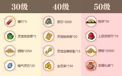 在进入游戏后,当角色达到相应等级时可获得额外的成长礼包。等级越高,获得的礼包越丰厚。尤其是,当角色等级到达三十级时,可获得爆竹*5、灵宠资质单*5、铜钱*20W、精气灵石*20;当角色到达四十级时,可获得原石*3000、灵宠抽奖券*20、灵宠宝箱钥匙*15、金芝麻*150;当角色等级到达五十级时,可获得绑定烧饼*50 、上品资质丹*10 、铜钱*300W,还有神秘变强礼袋等你来拿。