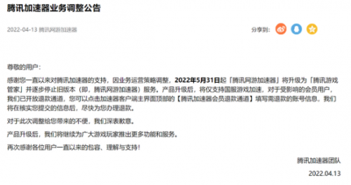 腾讯加速器官方发布公告宣布,因业务运营策略调整,2022年5月31日起腾讯网游加速器将升级为腾讯游戏管家,之后将仅支持国服游戏加速,对于受影响的会员用户已开放退款通道。