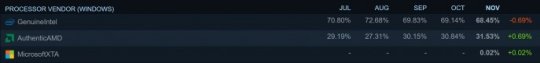 CPU方面,AMD继续增加份额。调查参与者中AMD处理器的份额上升到31.53%,上涨0.69%。