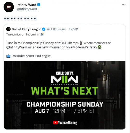 在Twitter上,动视称IW将在8月7日举行的《使命召唤》冠军联赛上分享新的消息。