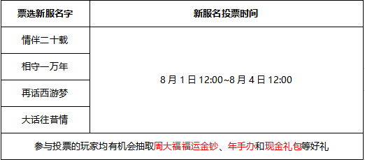 忆往昔峥嵘,这一路我们相伴走过,不知不觉已经共度二十载时光。大话给了兄弟们一片广阔的三界天地,而所有兄弟则还大话以一个情义的江湖。相知相伴,不离不弃,感恩这一路有你。8月12日《大话西游2免费版》二十周年庆新服【票选新服】即将隆重开启,诚邀各位兄弟一起票选新服名称。与以往四字名称的服务器不同,新服将从“情伴二十载”“相守一万年”“再话西游梦”“大话往昔情”4个特别的五字名称中命名,更加彰显二十周年新服的特殊纪念意义。参与投票的玩家更有机会抽取周大福福运金钞、年手办和现金礼包等好礼,即刻前往投票页面进行投票>>>(https://dh2.163.com/xfkq/qkds/)