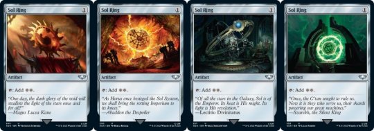 威世智公布了万智牌与《战锤40000》联动的更多细节:除了四套指挥官预组外,还有四枚不同风格的阳光戒,分别以人类帝国、泰伦虫族、太空死灵以及混沌阵营为主题。