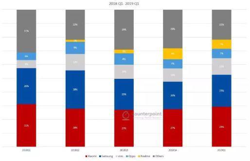 据CounterointResearch的数据显示,2019年第一季度,印度智能手机市场份额前五分别是小米(29%)、三星(23%)、vivo(12%)、Opo(7%)、Realme(7%)。印度可以说是国产厂商的后花园了。