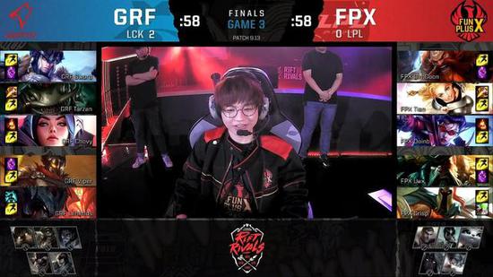 在0:2比赛落后的情况下,FPX上场迎战LCK最强战队GRF,在这场比赛中FPX战队选择破釜沉舟拿下下路薇恩和中路潘森,就是要强行在前期打疯狂的四包二,拿下了前中期的优势,GRF战队则快速地以下路维克托双工资装套路应对。