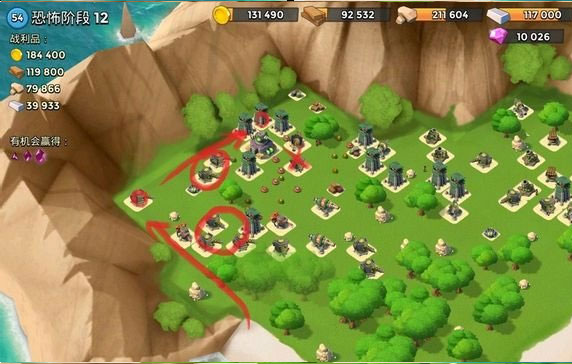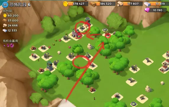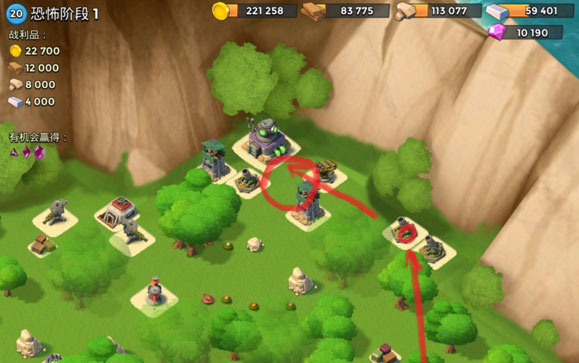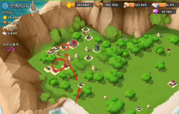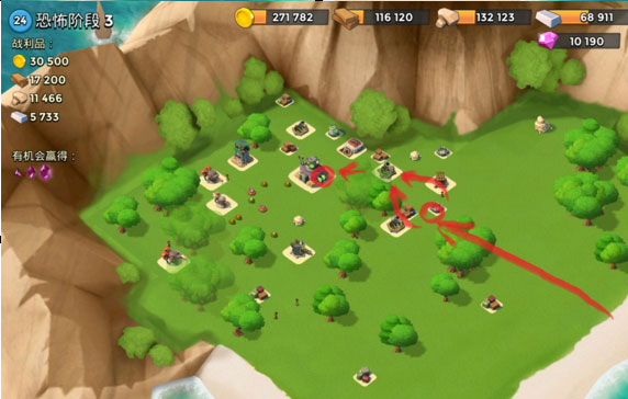 先炸掉连着的大加农和机枪,然后多管和导弹炸掉左侧的两个机枪,引导左上角机枪并登陆,路上给红圈冰冻,快要打掉机枪时往右上角的狙击扔一发引导,然后自动拆就行。