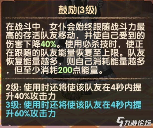 同为光三宝中的一员,大招更为直接,将自己的能量奉献给队友使队友频繁释放必杀技,同时她可以陪伴在队友周围为队友提升攻击力,如果附身的队友是近战,那她也可以进入到年兽的屏障里,不受减伤效果影响,打出成吨伤害。
