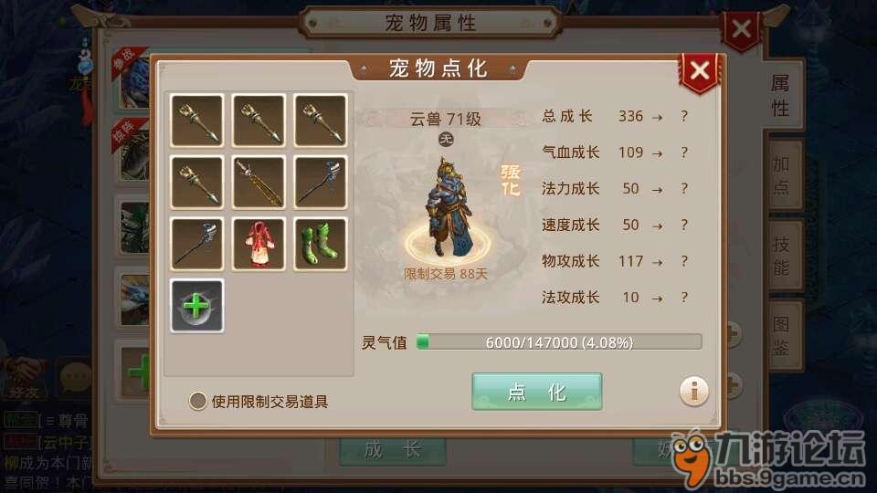 ①野生宠物不能点化,绿装备、强化过的装备、价值过低的装备不能作为灵气喂养宠物。