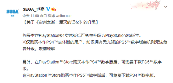 今日(5月18日),世嘉官方发布微博公布了PS平台《审判之逝:湮灭的记忆》的次世代升级情况介绍,本作的PS4实体版可以免费升级为PS5版本,购买了PS4/PS5数字版游戏的玩家均可以免费获得另一世代主机上的数字版游戏。