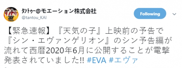 新海诚导演的新片《天气之子》今天(7月19日)在日本正式公映,据多位日本网友在推特爆料,《新世纪福音战士 新剧场版:│▌》的新预告片于《天气之子》放映前(在影院)播送,并公布《新世纪福音战士 新剧场版:│▌》的上映时间为2020年6月。