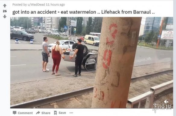 也有自己的车翻了还能闲下心吃西瓜的“真吃瓜群众”。