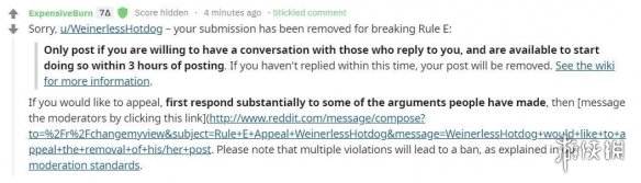 实际上r/changemyview的规则文本就长达数千字,对参与者的限制细节到了用词,一旦出现出格的情况,回复会被删除,不予采纳。
