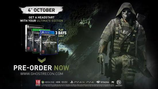 《幽灵行动:断点》将于10月4日发售,登陆PC,PS4,Xbox One和谷歌Stadia。PC版不登陆Steam,而是Uplay和Epic商城。官方将于9月5日-8日开启一个BETA测试,有兴趣的玩家可以去官网注册,碰碰运气。
