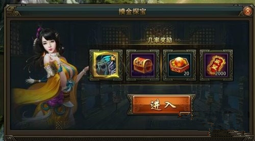 摸宝探金有几率获得奖励:神兽螭首碎片(概率小编实验室十把获得一个),紫装礼盒(概率小编实验室八把获得一个),升星丹20个(把把都会有),威望2000点(也是把把都会有)。