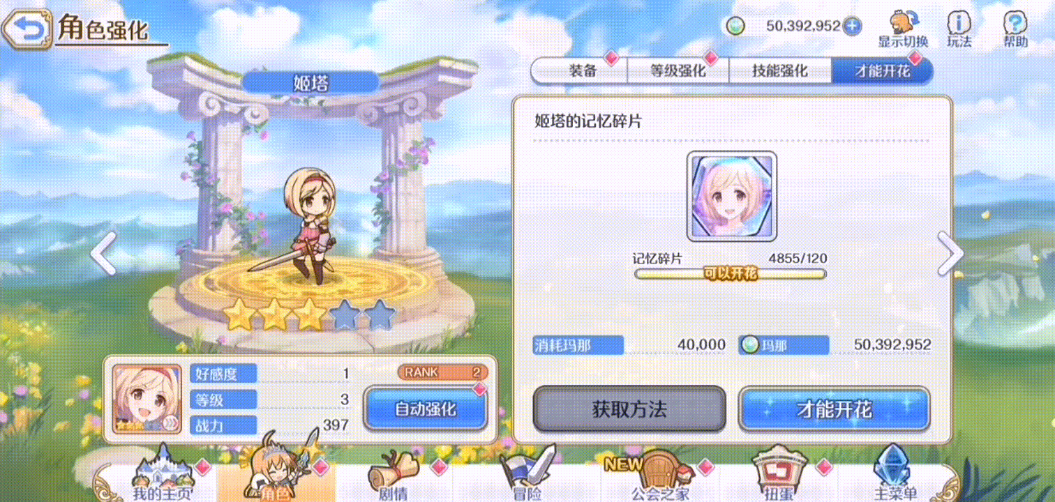 实力提升是为了更好地保护骑士君,技能也是实力的一部分!消耗一定数量的[玛那],就能将技能进行升级啦,看着伤害点数不断增加,对她们的表现也越来越满意了呢~