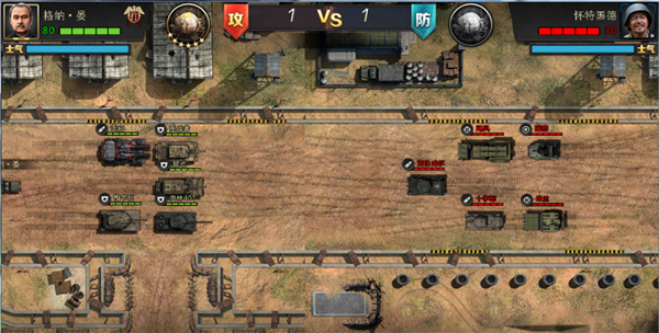 《战地指令》采用的是即时制顶视角的战斗方式。敌我双方坦克会按照各自的攻击间隔进行普攻或者技能攻击。先把对方全部消灭的一方为胜者。战斗中攻击方的队伍显示在左边,防守方的队伍显示在右边。在大部分打关卡的战斗中,玩家是可以操作我方坦克释放能量技能的。如下图: